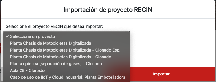 Una vez seleccionado el botón, se nos abrirá una ventana que nos traerá la lista de todos nuestros proyectos creados en RECIN para que seleccionemos cuál deseamos importar