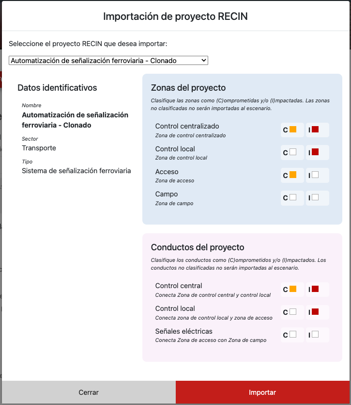 En el siguiente paso, ESCIM nos traerá toda la información de dicho proceso y nos permitirá seleccionar para cada zona y para cada conducto, cuál ha sido comprometido y cuál ha sido impactado para nuestro escenario: