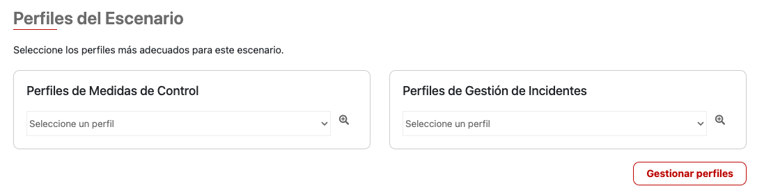 Una vez cargada la información correspondiente a la organización y temas generales del escenario, es importante seleccionar los perfiles de “Medidas de Control” y de “Medidas de Gestión de Incidentes” utilizando los menúes desplegables para cada caso (los cuales mostrarán los perfiles generados anteriormente según vimos en el capítulo correspondiente).